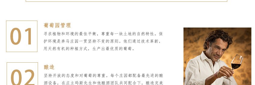 味蕾:酒體圓潤(rùn)柔順,層次豐富,平衡感極佳,果香濃郁,余味中帶有各種香料的味道。