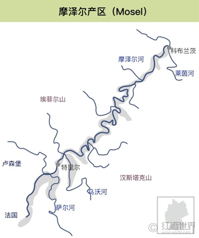 摩澤爾產(chǎn)區(qū)是德國13個法定葡萄酒產(chǎn)區(qū)之一,其產(chǎn)量在德國排名第三,不過,由于摩澤爾享譽國際的名聲,常常有人將其視為產(chǎn)區(qū)中的領(lǐng)頭者。摩澤爾產(chǎn)區(qū)包括摩澤爾河(Mosel River)及其支流薩爾河(Saar River)和烏沃河(Ruwer River)的河谷地區(qū),其名字也來源于摩澤爾河。實際上,在2007年8月1日之前,該產(chǎn)區(qū)名字為摩澤爾-薩爾-烏沃(Mosel-Saar-Ruwer),后來為了便于記憶而簡化為了摩澤爾。