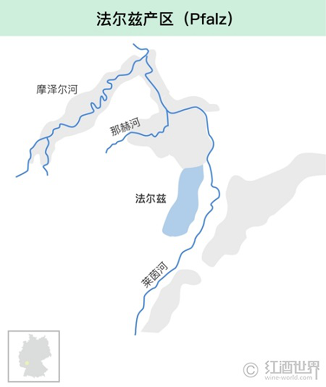 法爾茲產(chǎn)區(qū)北接萊茵黑森(Rheinhessen),南部、西部則與法國接壤,其葡萄園南北綿延達80公里。從面積上來說,法爾茲是德國第二大產(chǎn)區(qū),但其產(chǎn)量時常能夠占據(jù)13產(chǎn)區(qū)之首。產(chǎn)區(qū)名字“Pfalz”來源于拉丁語“palatium”,意為“宮殿”。