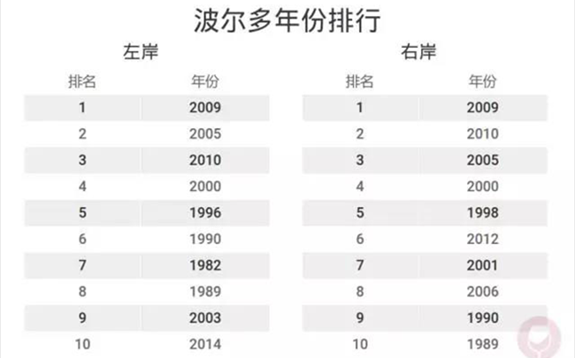 實際上,在波爾多的左岸和右岸地區,同一年份的表現也略有不同(見下圖)。