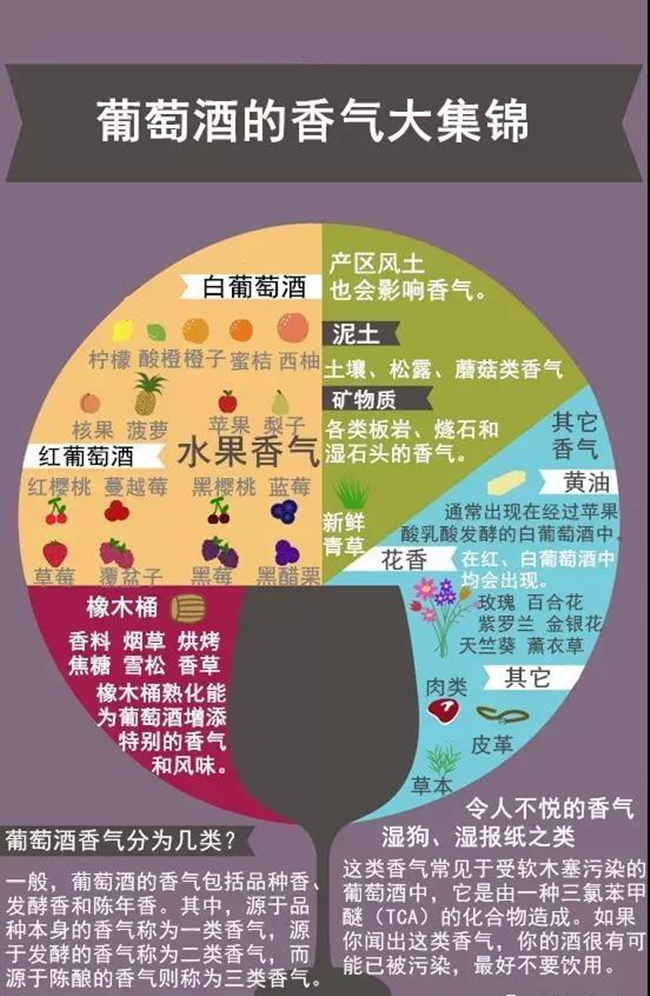 在葡萄酒的世界中至少存在著上百種不同的氣味。不是所有氣味都是容易識(shí)別的。為了鑒別,品酒師把這些氣味進(jìn)行分類重組。每組類別的定義及其包含的氣味各不相同,如水果可以分為柑橘類、紅色水果、黑色水果、熱帶水果等,糕點(diǎn)類可以分為黃油、餅干、奶油面包、吐司等,另外還有花卉類、木質(zhì)類、糖果類、植物類、香料類、動(dòng)物類和礦物類等,每一個(gè)類別你需要有一些香氣記憶的儲(chǔ)備(詳見附圖)。
