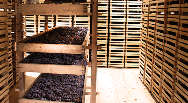 常見的風(fēng)干工藝之一是將果實(shí)留在葡萄藤上進(jìn)行自然風(fēng)干,待葡萄在藤上變干、糖分得到高度濃縮之后再采收,用于釀造甜酒。此種工藝對天氣條件有特定的要求,葡萄必須在溫暖干燥的秋季才能風(fēng)干,否則會容易感染灰霉菌。在法國蘇玳(Sauternes)產(chǎn)區(qū),倘若葡萄沒有成功感染貴腐菌,一些酒莊便會采用此方法幫助葡萄濃縮糖分,釀造出風(fēng)味濃郁、口感美妙的甜酒。用這種方式釀造出的葡萄酒有時會在酒標(biāo)上標(biāo)注“晚采收(Late Harvest)”。另外,也可將采摘后的葡萄鋪在草席上于室外曬干,又或者把葡萄放置于干燥通風(fēng)的屋子中風(fēng)干〔此風(fēng)干工藝在意大利瓦坡里切拉(Valpolicella)產(chǎn)區(qū)廣泛使用,在當(dāng)?shù)乇环Q作“枯藤法”(Appassimento)〕。風(fēng)干后的葡萄流失了大量水分,果實(shí)中的糖分和風(fēng)味物質(zhì)得以濃縮,因此釀成的葡萄酒擁有飽滿的酒體和較高的酒精度,風(fēng)味也十分濃郁。