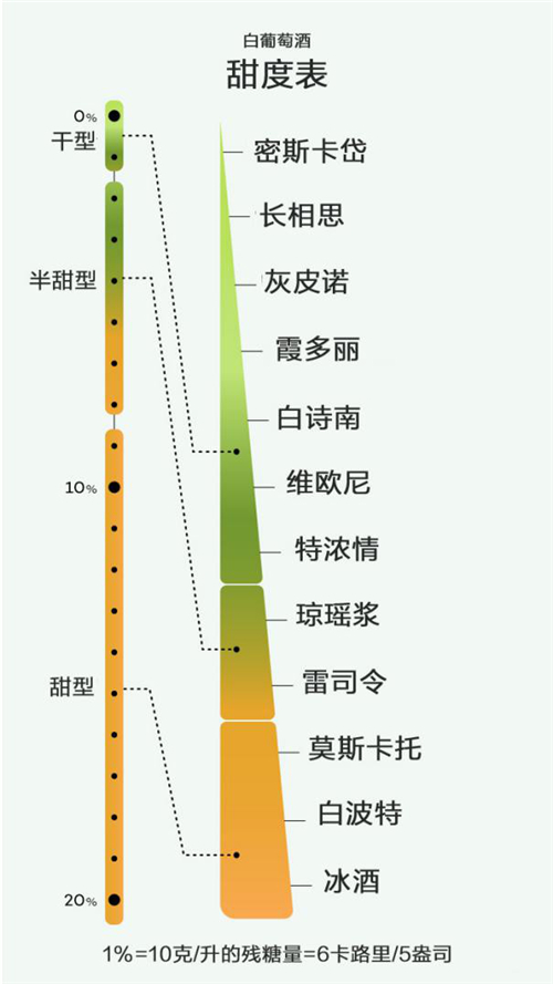 白葡萄酒中,密斯卡岱、長相思(達格諾酒莊絲萊克白)、灰皮諾、霞多麗(默爾索酒莊白)和白詩南葡萄酒通常被釀成干型的風(fēng)格,維歐尼、特濃情(比薩諾酒莊家族白)和瓊瑤漿(圣雷米埃連維園老藤干白)葡萄酒通常被釀成近乎干型的風(fēng)格,而雷司令葡萄酒、莫斯卡托葡萄酒、白波特和冰酒則通常被釀成甜型的風(fēng)格。