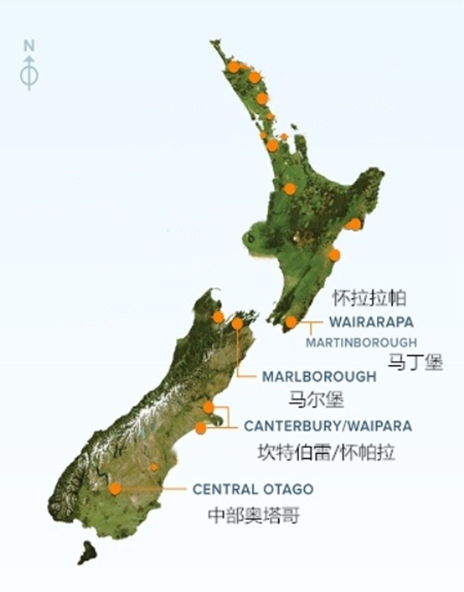 馬丁堡的面積較小,其位于北島(North Island)最南端的懷拉拉帕(Wairarapa)產(chǎn)區(qū),與馬爾堡隔海相望。馬丁堡四周山脈和丘陵環(huán)繞,受海洋季風(fēng)的影響較小,降水稀少,是北島最干燥的產(chǎn)區(qū)之一。同時(shí),因夜間山頂?shù)睦淇諝鈺?huì)沿著山坡下沉,葡萄園的晝夜溫差較大,有助于葡萄緩慢地積累風(fēng)味物質(zhì)。產(chǎn)區(qū)的土壤主要由礫石與沖積土構(gòu)成,土質(zhì)貧瘠且排水性佳,有利于葡萄樹(shù)扎根深處并汲取更多復(fù)雜風(fēng)味。