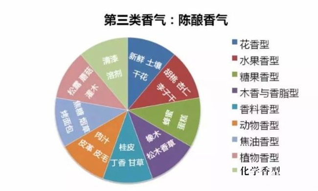 簡單來說,如果你品鑒一瓶葡萄酒時,聞到水果的味道,那就是一類香氣;如果聞到奶油、甜點類的香氣那就是二類香氣;三類香氣則更加復雜與廣泛,花香、糖果香、動物香型都是三類香氣的分支,這下你直到這三類香氣是如何區分的了么?