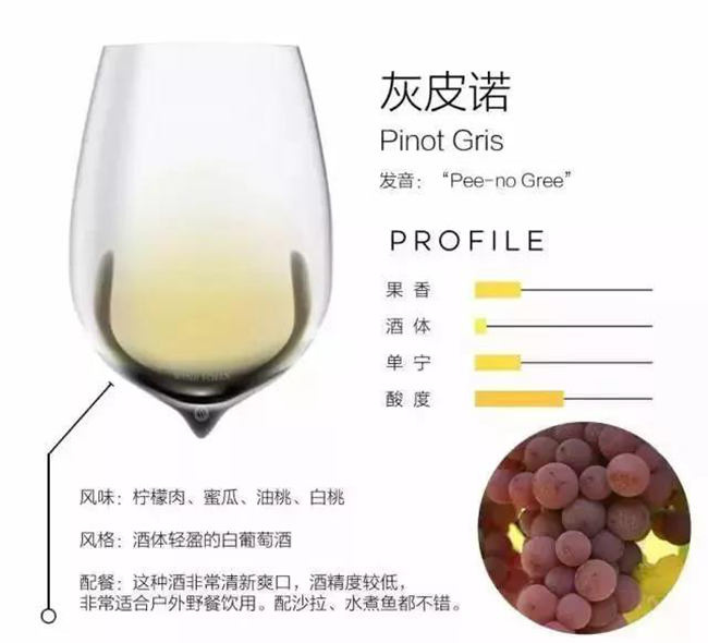 灰皮諾是一款源自意大利北部和法國的、干型、酒體輕盈的白葡萄酒。這種葡萄酒非常清新爽口,酒精度較低(12%),非常適合戶外野餐飲用。