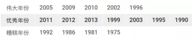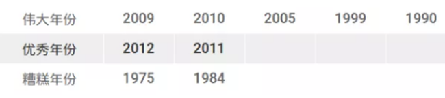 建議:如果想要一瓶馬上可以喝的品質(zhì)優(yōu)異的勃艮第的話,2009年份是很好的選擇。這一年的勃艮第普遍酸度較低,單寧成熟度較高,適合較早飲用。2010年份的夜丘也不錯(cuò),不過該年份產(chǎn)量較低,不太容易買到合理價(jià)位的酒。2011年份則表現(xiàn)不均勻。對(duì)于收藏家來說,2005年份仍然是首選,前提是你現(xiàn)在還能買得到!