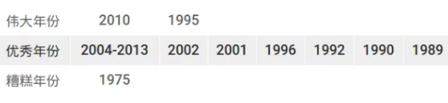 勃艮第雖然擁有許多超級(jí)名莊(如羅曼尼·康帝、亨利·賈伊等),但是在上世紀(jì)7、80年代,勃艮第的好年份乏善可陳。進(jìn)入21世紀(jì)之后,勃艮第的年份普遍評(píng)價(jià)較高,除了天氣條件較好之外,釀酒師的努力有目共睹。