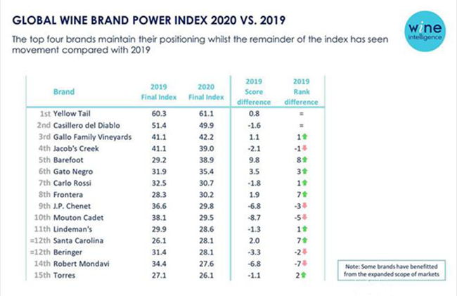 近日,葡萄酒智情機構(Wine Intelligence)發布了《2020年全球葡萄酒品牌影響力指數》(Global Wine Brand Power Index 2020)。澳大利亞和智利再次占據領先位置,黃尾袋鼠(Yellow Tail)和紅魔鬼(Casillero del Diablo)連續第三年分別蟬聯第一和第二名。