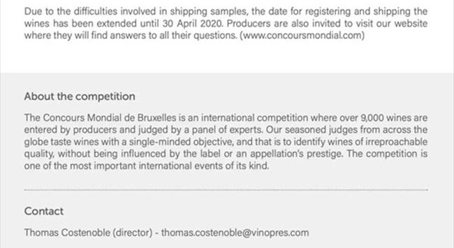 針對目前流行的Covid-19新型冠狀病毒對于全球的影響,在經(jīng)過組委會與主辦地的積極協(xié)商后,現(xiàn)決定“2020(捷克·布爾諾)比利時布魯塞爾國際葡萄酒大獎賽”將延期至2020年6月26日至28日舉辦。同時,為了緩解報名企業(yè)的物流運輸壓力,全球樣品征集截止時間也將適度順延。