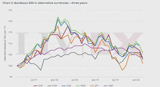 此外,波爾多500指數在過去12個月降低了3.6%,該指數追蹤二級市場上交易量最大的50款波爾多葡萄酒過去10年的價格走勢。過去一年,波爾多500指數使用英鎊的交易下跌3.6%,歐元下跌3.8%,美元下跌6.7%,日元下跌9.5%。