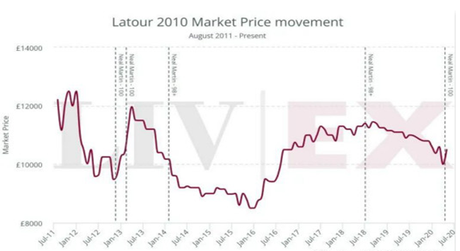 有跌有升,在接下來的幾年,此酒的價格開始隨大市走強而上升。然而,在2018年再次被確認98+分后,價格又再次波動。如今,此酒比其2011年時的前倫敦發行價(11,000英鎊 每箱12×75)折價5%。