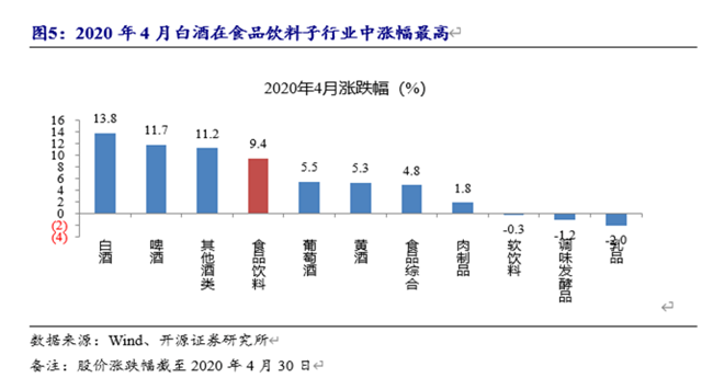 尤其是進入2020年4月份以來,食品飲料板塊上漲9.4%,其中重要原因是:國內疫情控制得當,消費回暖,以白酒為代表的可選消費重新獲得市場青睞,漲幅領跑各大品類,為13.8%,而葡萄酒銷售亦有上漲趨勢,為5.5%。
