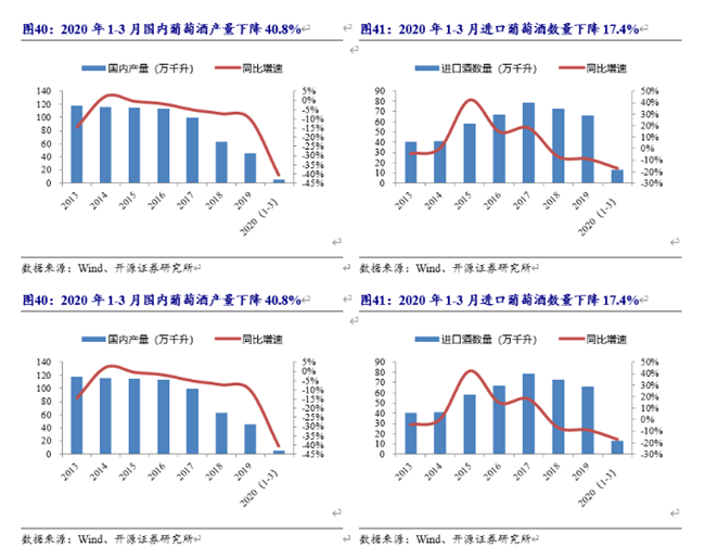觀察行業(yè)數據,2020年1-3月國內葡萄酒產量同比降40.8%,降幅較年初擴大;進口酒量同比下滑17.4%,同樣加速下滑。