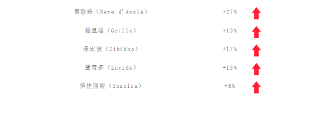 相較2018年,各葡萄品種增長如下,由此可以看出,黑珍珠(Nero d'Avola)、格里洛(Grillo)等代表的本土品種大放異彩,已經(jīng)成為西西里葡萄酒的嶄新名片。