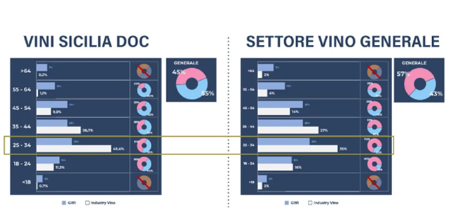 從參與西西里葡萄酒互動的用戶畫像上看,西西里法定產(chǎn)區(qū)葡萄酒的消費者要年輕很多,區(qū)間甚至低于整個葡萄酒消費的平均年齡段:25-34歲的人群非常集中。總體來說,消費者偏 "男性化",但在18-34歲的年輕群體中,女性消費者則更為突出。