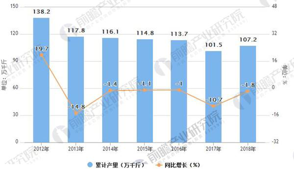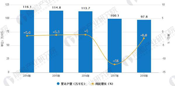 從前瞻產(chǎn)業(yè)研究院數(shù)據(jù)看出,我國(guó)葡萄酒的產(chǎn)量情況來看:2014-2017年以來我國(guó)葡萄酒呈逐年下滑態(tài)勢(shì)。2016年全國(guó)葡萄酒產(chǎn)量達(dá)113.7萬千升,同比下滑1%。2017年大幅下滑,產(chǎn)量為100.1萬千升,同比下滑12%。預(yù)計(jì)2018年中國(guó)葡萄酒產(chǎn)量將下滑至97.8萬千升。
