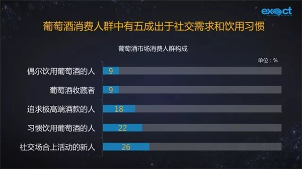 消費者人群的構成當中,剛開始在社交場合上活動的新人,和正逐漸形成葡萄酒飲用習慣的人群幾乎占據了整個人群的半壁江山。
