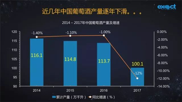 從統計數據看,2014-2017年,中國葡萄酒產量呈逐年下滑態勢。2017年中國葡萄酒產量為100.1萬千升,同比下滑12%。據業內人士認為,中國葡萄酒正處于調整優化期,劣質產能下滑,優質產能上升。一方面,進口品牌對中國葡萄酒產業造成巨大沖擊;另一方面,低端低價競爭把國產葡萄酒逼入死胡同。