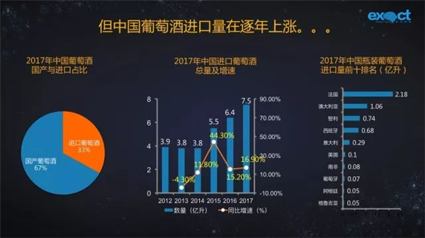 據統計數據顯示,2017年,中國消費的葡萄酒中約1/3來自于進口,進口總量為7.5億升,同比增長16.9%。其中七成多為瓶裝葡萄酒。從進口來源國來看,中國進口葡萄酒主要來自于法國、澳大利亞、智利、西班牙。