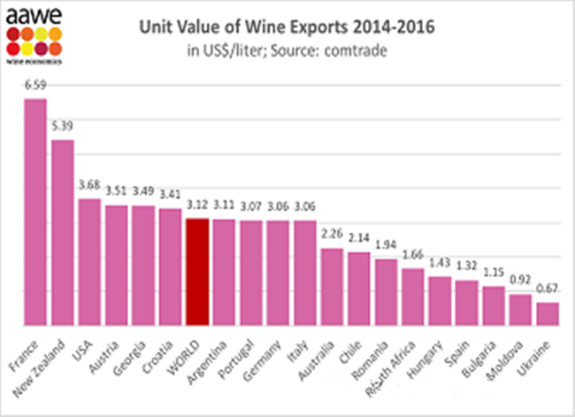 AAWE - 美國葡萄酒經濟學家協會是一個享有聲望的組織,根據他們的評級,法國排名第一(6.59美元),其次是新西蘭(5.39美元),美國排名第三(3.68美元)。奧地利領先格魯吉亞,排名第四(3.51美元)。