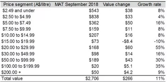 “在截止到9月30日的一年內(nèi),各個(gè)價(jià)格區(qū)間內(nèi)都有良好增長(zhǎng)。10澳元/升及以上的葡萄酒出口額增長(zhǎng)了20%至8.04億澳元,而20到29.99澳元之間的葡萄酒增長(zhǎng)尤其迅猛。10澳元/升以下的葡萄酒當(dāng)中,5到7.49澳元區(qū)間增速明顯,增長(zhǎng)了5000萬(wàn)澳元。”