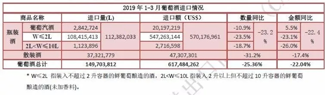 近日,中國食品土畜進(jìn)出口商會酒類進(jìn)出口商分會發(fā)布2019年一季度酒類進(jìn)口統(tǒng)計報告。報告顯示,一季度,進(jìn)口酒類市場整體呈下行態(tài)勢,且降幅仍在擴(kuò)大。其中,葡萄酒進(jìn)口延續(xù)跌勢,量額跌幅均逾兩成。進(jìn)口量1.5億升,進(jìn)口額6.2億美元,約占酒類進(jìn)口總額的55.4%。