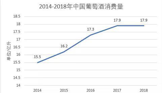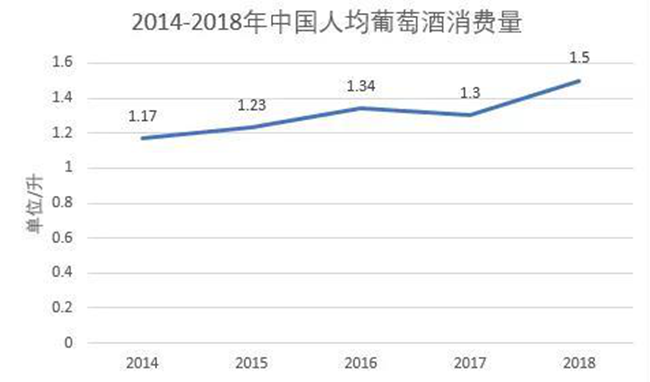 如上圖數(shù)據(jù)顯示,從2014-2018年,中國的葡萄酒人均消費量從1.17升上漲至1.5升,增長了28.2%,顯示出中國市場葡萄酒消費的強勁增長態(tài)勢。