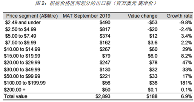 截至2019 年9 月底的12個月中,澳大利亞葡萄酒對中國市場 (包括香港和澳門)的出口額持續(xù)增長18%,創(chuàng)下12.5 億澳元新高,平均出口額上漲了40%至8.42 澳元/升(離岸價(jià))。