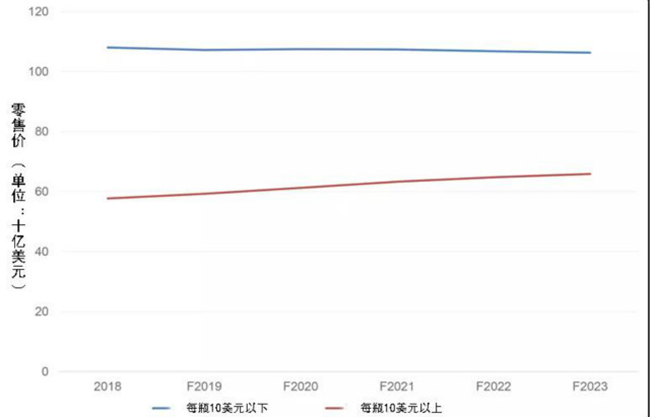 如果這些預測成真,這將意味著每瓶10美元以下葡萄酒的銷量份額將從87%降至85%,銷售額份額將從65%降至62%。