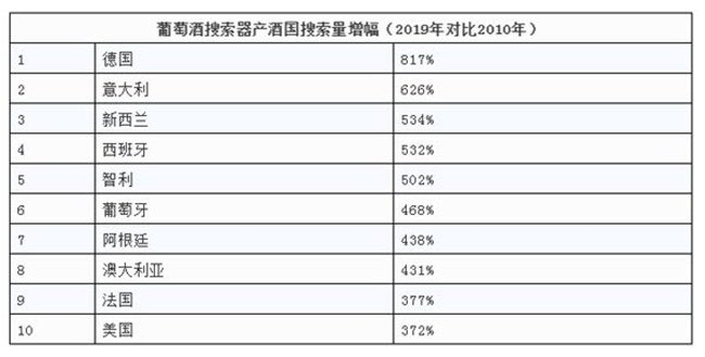 在2010年,前25大葡萄酒產酒國每月合計擁有360萬次搜索。在2019年,該數據為1505萬次,增長了430%。