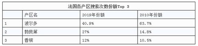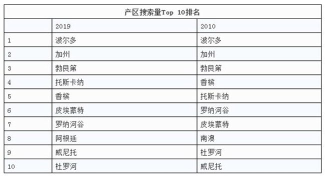 在2010年,以產區劃分搜索次數最多的依次為波爾多、加州、勃艮第、香檳、托斯卡納、羅納河谷、皮埃蒙特、南澳、杜羅河、威尼托。2019年,托斯卡納超越了香檳,皮埃蒙特超越了羅納河谷,威尼托超越了杜羅河。
