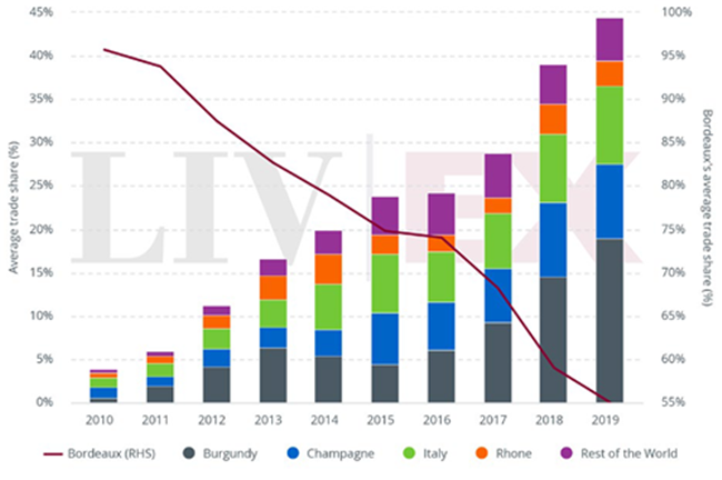 2010年至2019年(至今)在Liv-ex上的酒區市場份額