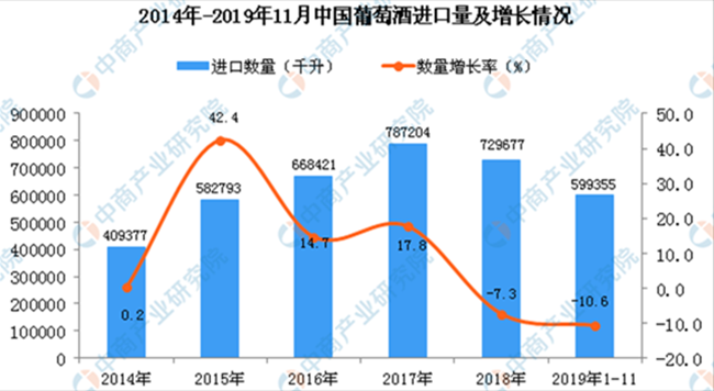 據中商產業研究院數據庫顯示,2014-2017年中國葡萄酒進口量逐漸增長,2018年中國葡萄酒進口量有所下降;2019年1-11月中國葡萄酒進口量為599355千升,同比下降10.6%。