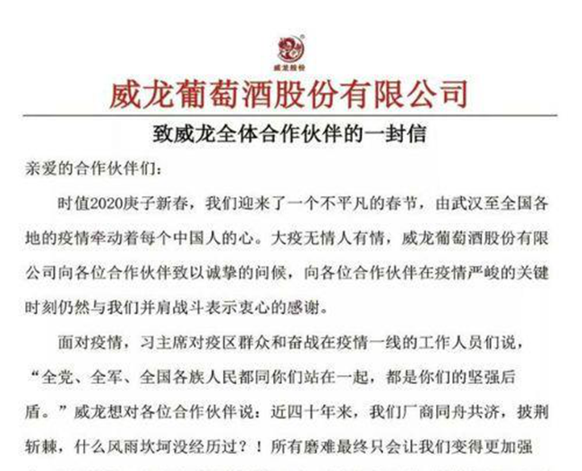 在威龍葡萄酒發布的公開信中能看到,企業正試圖通過“攜手并肩,共渡時艱”這樣的積極話語來增強與合作伙伴之間的聯系。記者從威龍葡萄酒方面進一步了解到,除了在公開信中表達的正面語言,企業還提出了具體的“渡過時艱”舉措,例如陸續恢復物流配送以保障合作伙伴的訂單發貨需求、強化疫情管控等。