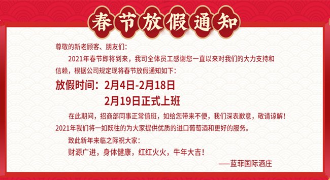 白駒過隙,又是一年春節(jié)到!惜別2020年,迎來了充滿希望、機(jī)遇和挑戰(zhàn)的2021年!正值中國的傳統(tǒng)節(jié)日“春節(jié)”來臨,在此藍(lán)菲酒業(yè)全體員工向大家拜個早年!恭祝大家新春快樂,財源廣進(jìn)!
