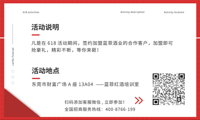“618”購物狂歡節是與‘雙11’遙相呼應的一個全民網購狂歡節,現已逐漸成為線上線下綜合的全民購物狂歡節。為迎接618狂歡慶典的到來,藍菲特舉辦“藍菲618,我要發”系列活動,惠饋我們新簽約合作的加盟商/代理商們,與我們共建紅酒事業。